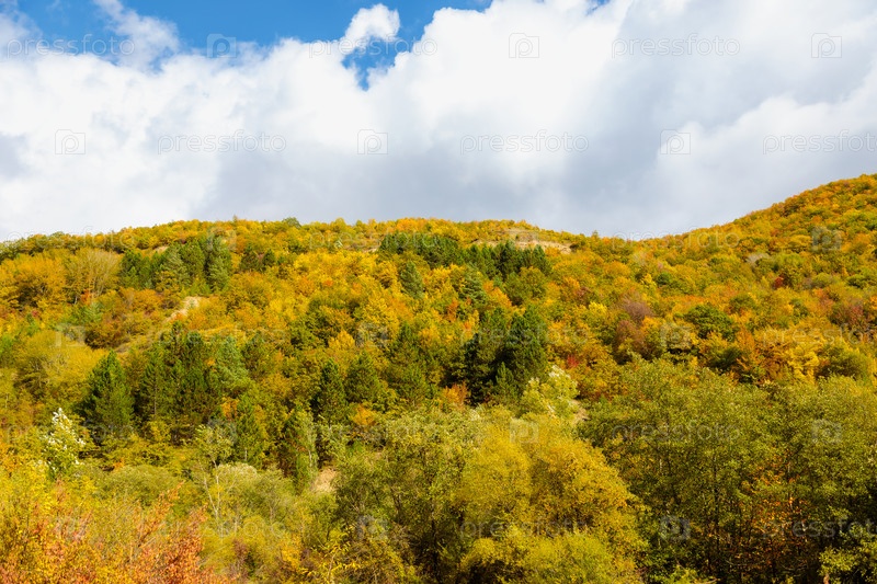 Теплая осень в горах, покрытых яркими осенними деревьями. Красочный пейзаж