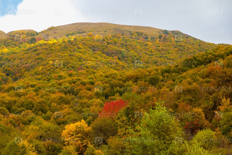 Теплая осень в горах, покрытых яркими осенними деревьями. Красочный пейзаж