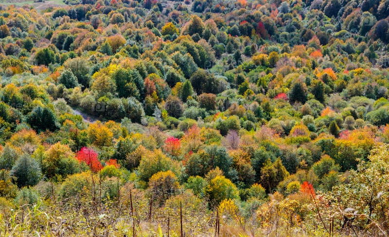 Теплая осень в горах, покрытых яркими осенними деревьями. Красочный пейзаж