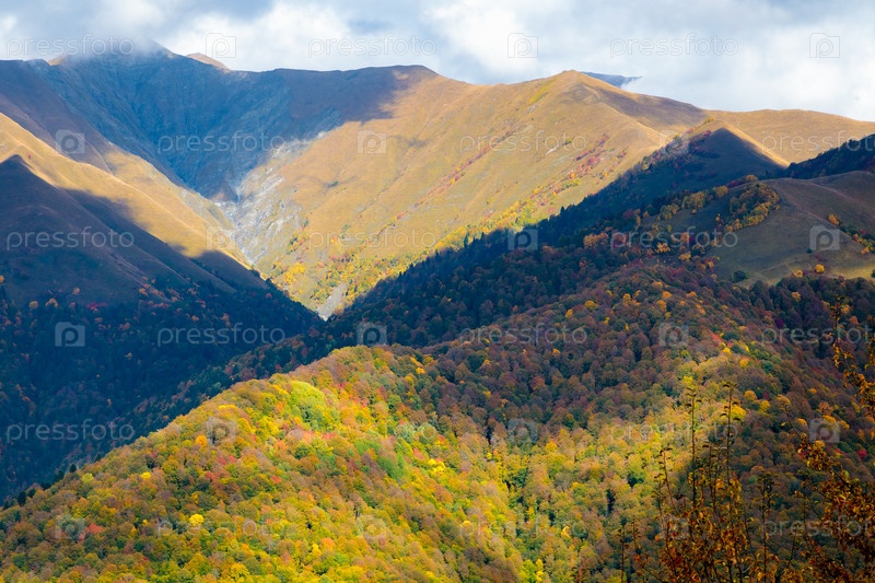 Солнечная осень в горах, покрытых яркими разноцветными деревьями. Красочный пейзаж