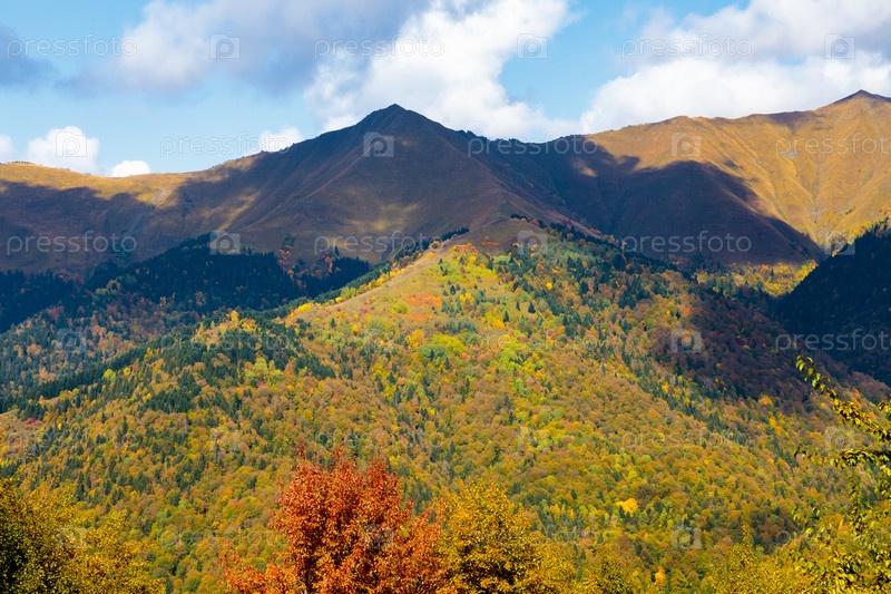 Солнечная осень в горах, покрытых яркими разноцветными деревьями. Красочный пейзаж
