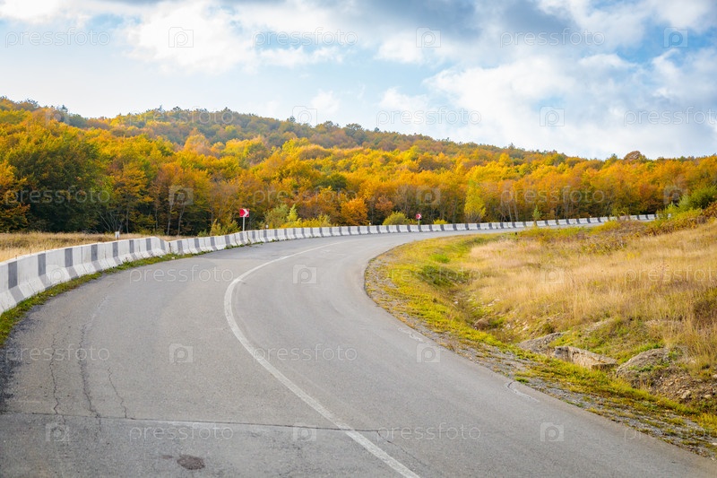 Извилистая дорога в горы. Солнечная осень в горах, покрытых яркими разноцветными деревьями