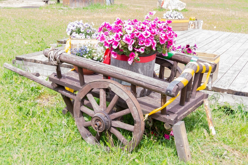 Деревянная тележка с цветами. На деревянной тележке кашпо с цветками. Красиво оформленная территория. Wooden cart with flowers. There are pots with flowers on a wooden cart. Beautifully decorated territory