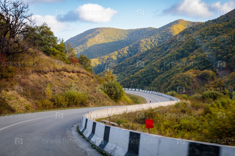 Извилистая дорога в горы. Солнечная осень в горах, покрытых яркими разноцветными деревьями