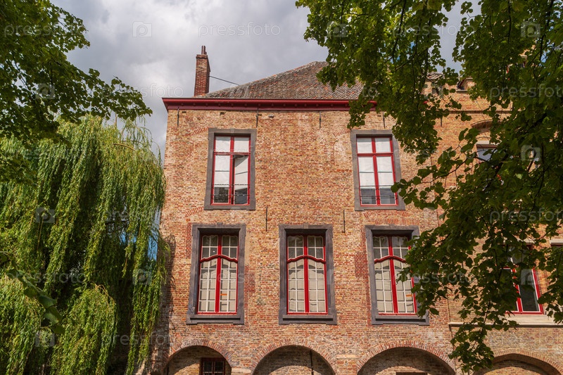 Брюгге, Бельгия. Вид на старое кирпичное здание с большими окнами