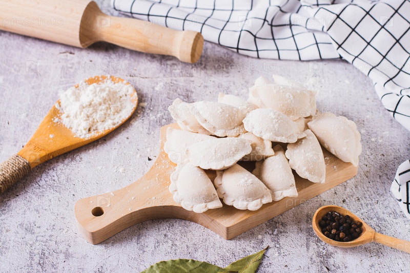 Замороженные сырые пельмени с картофелем на разделочной доске на столе