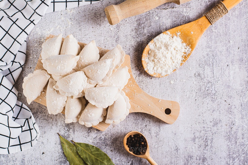 Домашние сырые пельмени с мясом на разделочной доске на столе, вид сверху