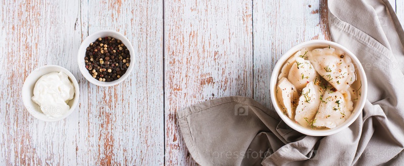 Суп с пельменями, зеленью, специями и сметаной в миске на столе, вид веб-баннера
