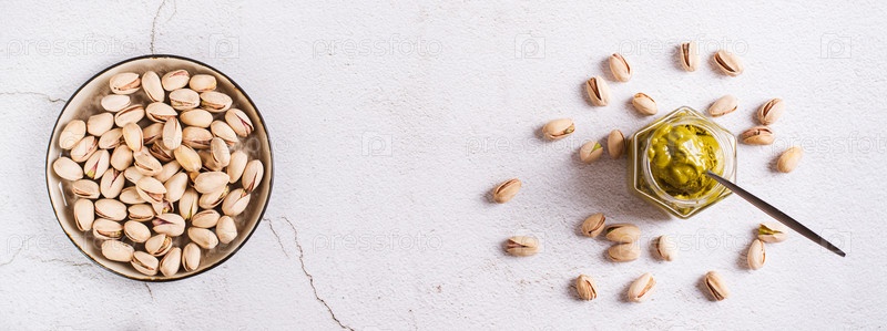 Банка с фисташковым сливочным маслом и фисташками на столе, вид веб-баннера