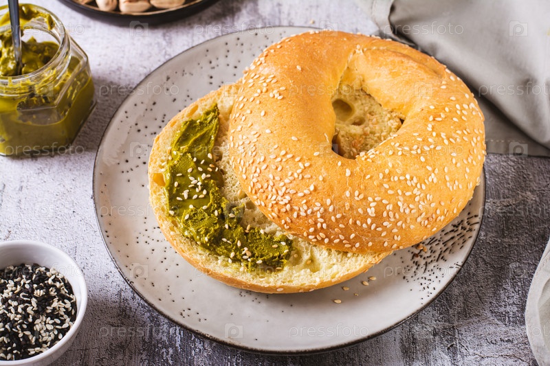 Бублик с фисташковым сливочным маслом и банка масла на тарелке на столе