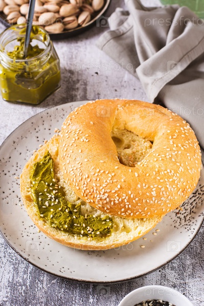 Бублик с фисташковым сливочным маслом и банкой масла на тарелке на столе, вертикальный вид