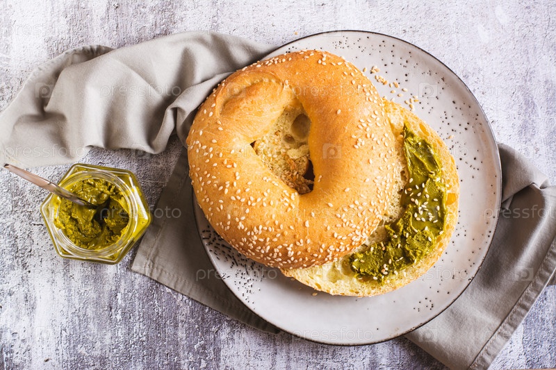 Крупным планом бублик с фисташковым сливочным маслом на завтрак на тарелке на столе, вид сверху