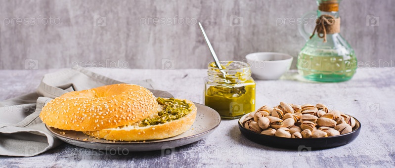 Бублик с фисташковым сливочным маслом и орехами на завтрак на тарелке на столе веб-баннер