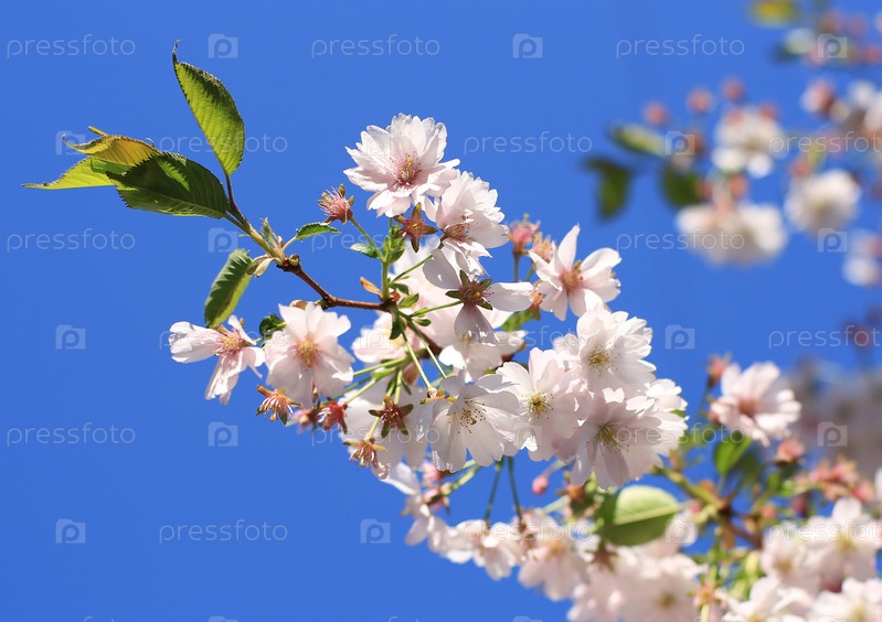 Голубое небо с редкими облаками и цветущими ветвями деревьев