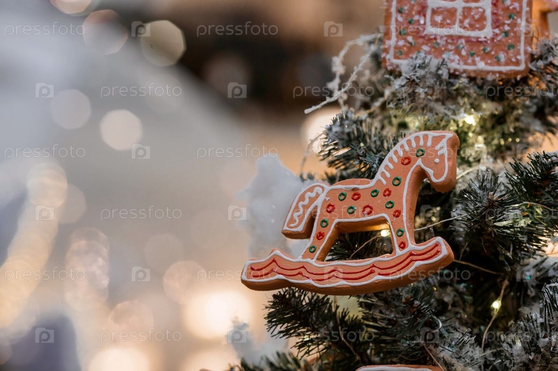 Красивые праздничные украшения на елке. Крупный план. Красивый рождественский фон. Концепция украшений и декора к новому году. Новогодняя открытка 2024