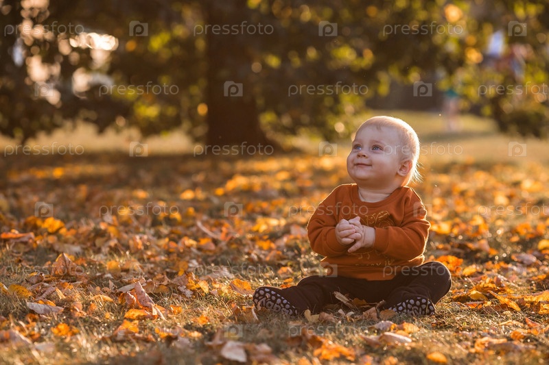 Портрет маленького мальчика 9 месяцев на открытом воздухе. Счастливый ребенок в осеннем парке. На ребенке ярко-оранжевый свитер. Счастливое детство и родительство