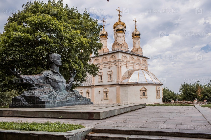 Россия, город Рязань, август 2023 года. Памятник поэту Сергею Есенину на фоне церкви Спаса-на-Яре в Рязани