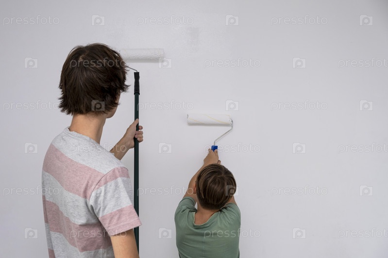 Дети красят стену валиком. подростки проводят время вместе, помогая делать ремонт