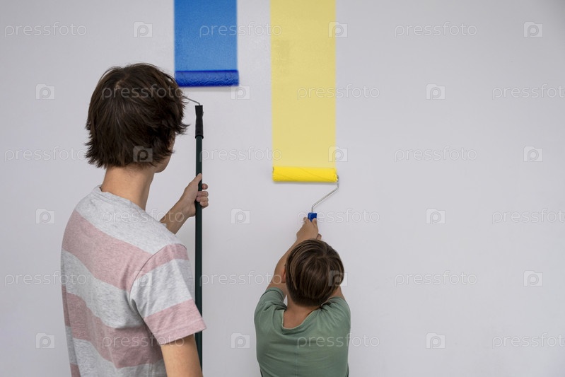 Дети красят стену валиком. подростки проводят время вместе, помогая делать ремонт