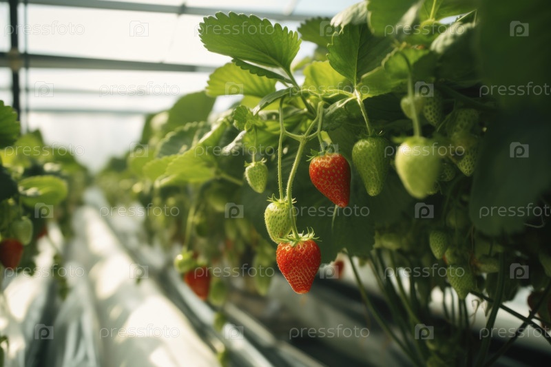 Растение клубники растет в овощной теплице на гидропонике, экологически чистом бизнесе, тепличной гидропонике. система капельного орошения для растений