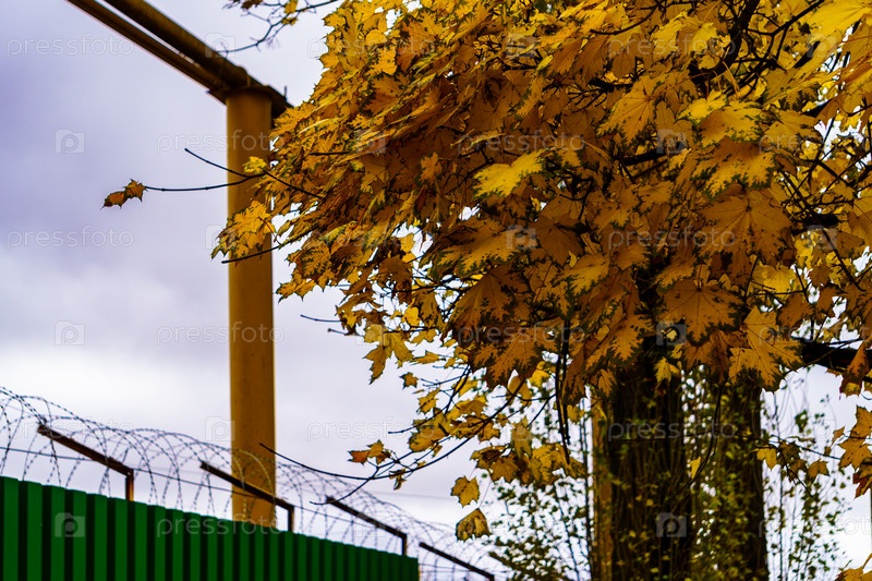 Клен с желтыми листьями осенью, на фоне забора с колючей проволокой