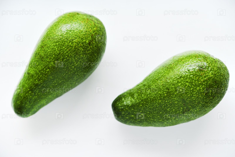 Спелые сочные плоды авокадо на белом фоне. Вегетарианские овощи. Зеленые фрукты