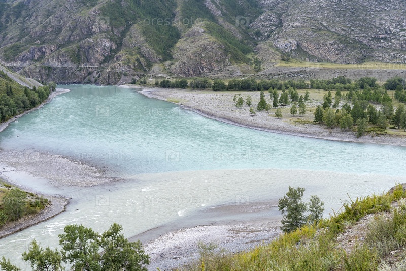 МЕСТО СЛИЯНИЯ РЕК КАТУНЬ И ЧУЯ В ГОРАХ АЛТАЯ. СИБИРЬ, РОССИЯ