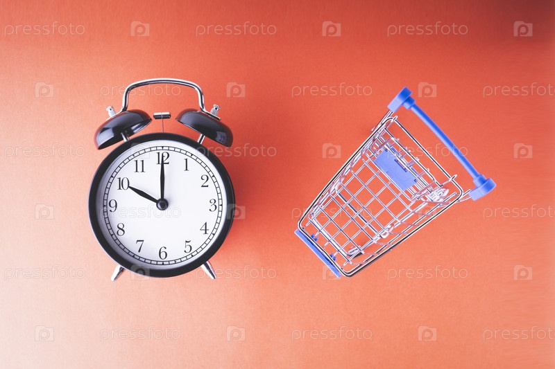Пустая корзина для покупок и будильник на красно-алом фоне