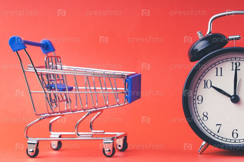 Пустая корзина для покупок и будильник на красно-алом фоне