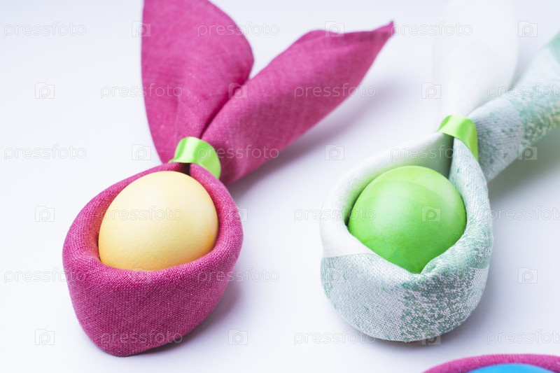 Пасхальные яйца и форма кроличьих ушей, на белом фоне, выборочный фокус, тонированное изображение
