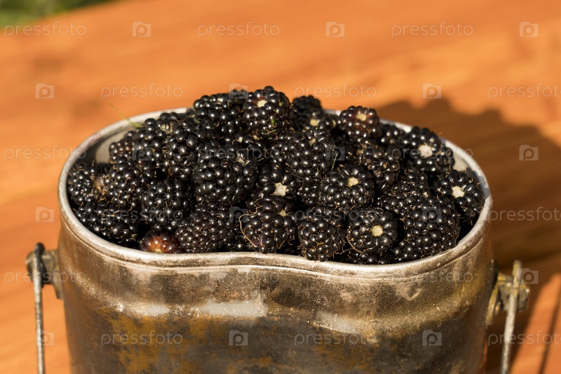 Свежая лесная ежевика, собранная в металлическую посуду, крупный план, выборочный фокус, тонированное изображение, ягода Шварцвальда