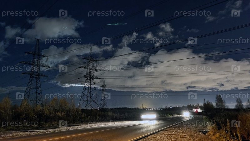 Ночное пригородное шоссе под линиями электропередач. Темно-синее небо с белыми облаками, асфальтированная дорога без освещения. Машины едут по дороге с включенными фарами, оставляя за собой длинный световой след