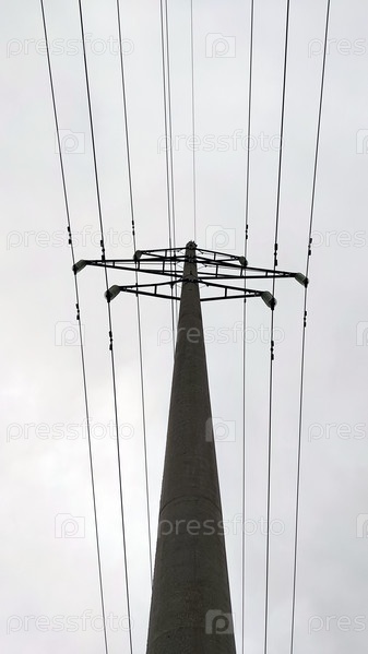 Высокий бетонный столб с электрическими проводами. Цементный столб линии электропередачи под светло-серым небом, покрытым облаками. Опра держит несколько металлических проводов под высоким напряжением