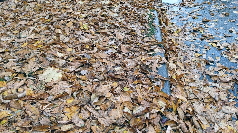 Опавшие желтые каштановые листья. Опавшие листья деревьев лежат на земле сплошным слоем. Они почти полностью покрывают поверхность земли и асфальта. Листья коричневые, желтые и красные