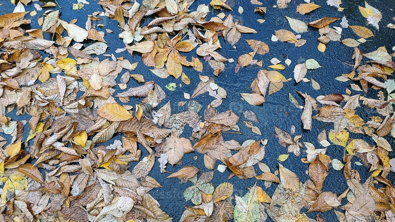 Опавшие желтые каштановые листья. Опавшие листья деревьев лежат на земле сплошным слоем. Они практически полностью покрывают поверхность земли и асфальта. Листья коричневые, желтые и красные