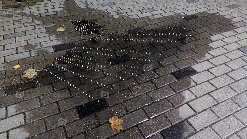 Отражение новогодней гирлянды. На серой поверхности дороги, вымощенной прямоугольным камнем, лужа воды после осеннего дождя. Светящиеся огни гирлянды отражаются от воды