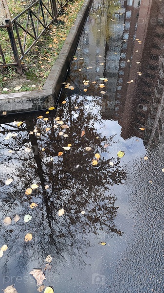 Отражение дома в луже воды. На черном мокром тротуаре после осеннего дождя лужа воды. От его поверхности отражаются небо и часть высокого дома