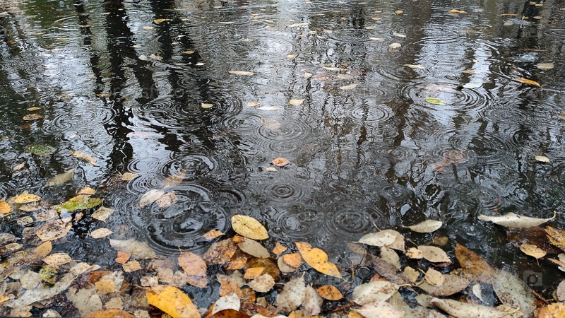 Большая лужа воды на мокром асфальте. Асфальтированная дорога с лужей. Опавшие желтые и коричневые листья деревьев плавают в прозрачной воде. На поверхности воды круги от падающих капель дождя