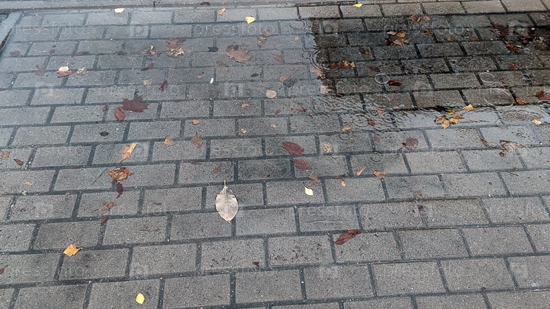Лужа воды на серой дороге. Осенний дождь на дороге, вымощенной прямоугольной каменной лужей чистой воды от дождя. Видны капли дождя и опавшие листья