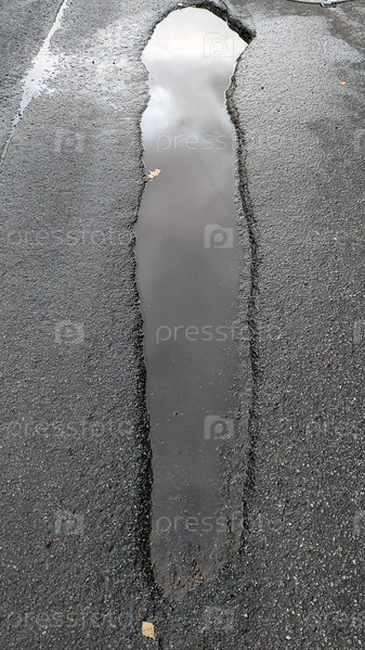 Лужа воды на черном асфальте. Проезжая часть по черному асфальту с длинной ямой, в которой есть вода. Облака отражаются от поверхности лужи с прозрачной дождевой водой