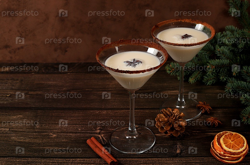 Рождественский мартини с корицей и мускатным орехом на темном фоне с еловыми ветками, концепция рождественских и зимних праздников. Согревающий яичный напиток в холодное время года,
