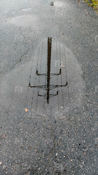 Отражение опоры линии электропередачи. На черном мокром асфальте после осеннего дождя скопилась лужа воды. От его поверхности отражается высокий бетонный столб высоковольтной линии электропередачи