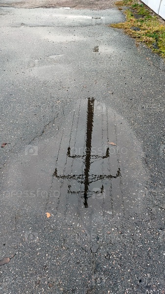Отражение опоры линии электропередачи. На черном мокром асфальте после осеннего дождя скопилась лужа воды. От его поверхности отражается высокий бетонный столб высоковольтной линии электропередачи