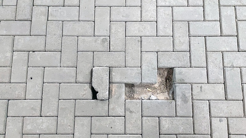 Яма на ровном дорожном покрытии. На серой дороге, вымощенной прямоугольным дорожным камнем, не хватает двух камней. На их месте виден песок, из ровной кладки слегка вырван еще один камень
