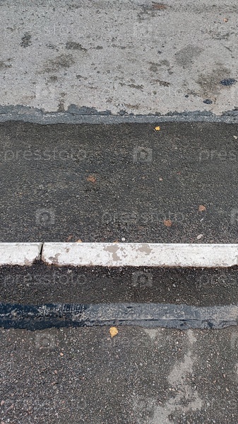 Мокрый и сухой асфальт. край черной асфальтированной дороги отделен от пешеходной части невысоким серым бордюром. Часть асфальта на дороге сухая и имеет серый цвет, часть мокрый черный