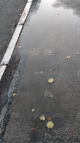 Лужа воды возле обочины. край черной асфальтированной дороги отделен от пешеходной части невысоким серым бордюром. На дороге лужа чистой дождевой воды