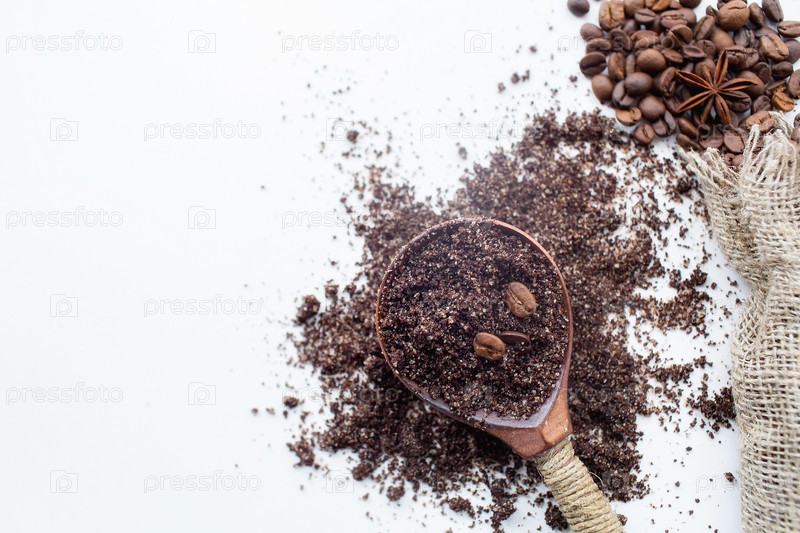Спа-процедуры. Натуральный кофейный скраб для тела. Натуральная косметика для тела на белом фоне, вид сверху. Место для надписи. Концепция красоты и здоровья
