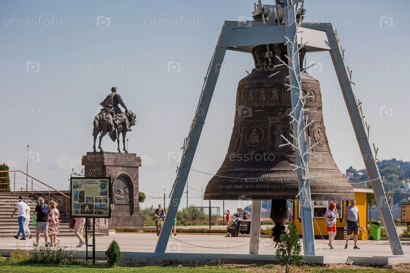 Соборный колокол на территории собора Александра Невского в Нижнем Новгороде на Стрелке. Россия, Нижний Новгород, август 2023 г