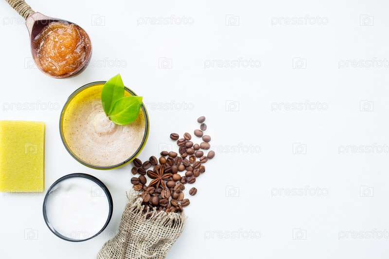 Спа-процедуры. Натуральный кофейный скраб для тела. Натуральная косметика для тела на белом фоне, вид сверху. Место для надписи. Концепция красоты и здоровья