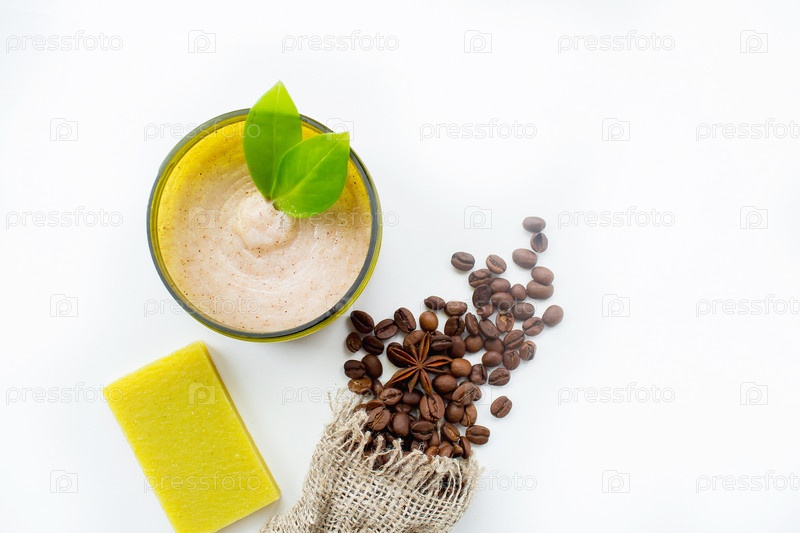 Спа-процедуры. Натуральный кофейный скраб для тела. Натуральная косметика для тела на белом фоне, вид сверху. Место для надписи. Концепция красоты и здоровья